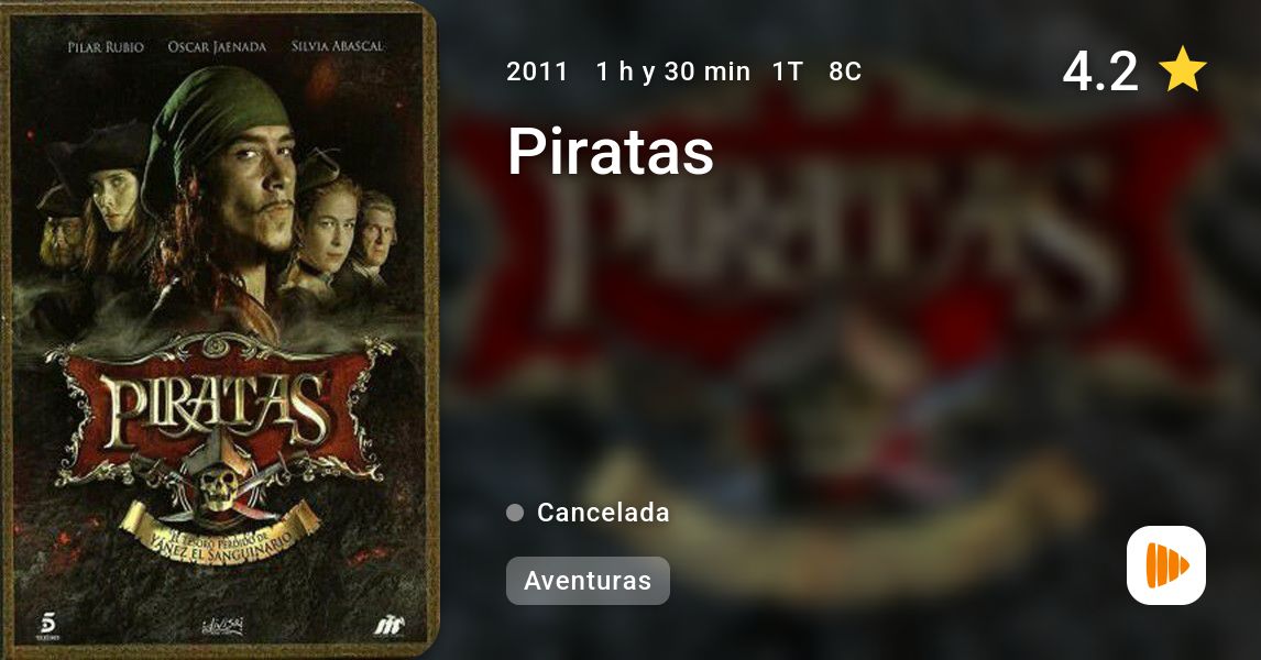 Serie de TV (2011). 8 episodios. Ambientada en el siglo XVIII, "Piratas" narra las aventuras de Álvaro Mondego (Óscar Jaenada), un noble venido a menos, canalla, descarado, embaucador y con una pasión desmedida por las mujeres que, obligado por las circunstancias, ha de convertirse en pirata. En el devenir de su nueva suerte, Mondego se encontrará con una aguerrida y sensual pirata, Carmen Bocanegra (Pilar Rubio), y juntos correrán mil y una aventuras.